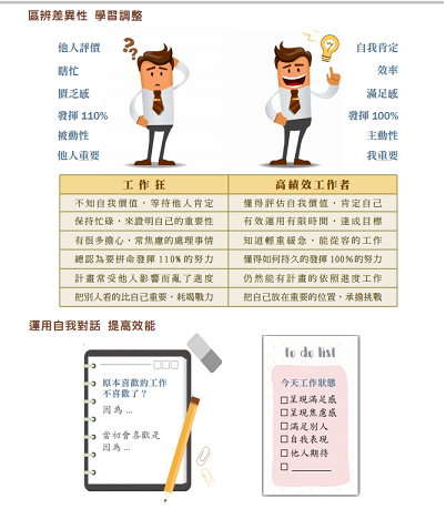 高績效工作者對成功有明確定義,知道該把心力放在哪些地方,並放下其他不那麼重要的部份,總是從容的做著工作,工作狂往往沈溺在自己永遠不夠的焦慮感中,工作是不是不夠努力、工作表現不夠好、工作時間不夠用,並將這焦慮感無限擴大,讓自己總是在焦慮中做著每件事情。