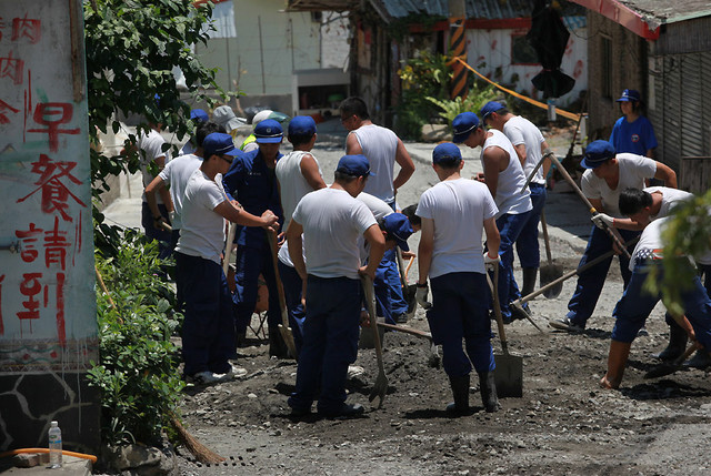 村內的馬路也被氾濫的溪水弄得殘破不堪,國軍也動員來幫忙搶鋪路面。