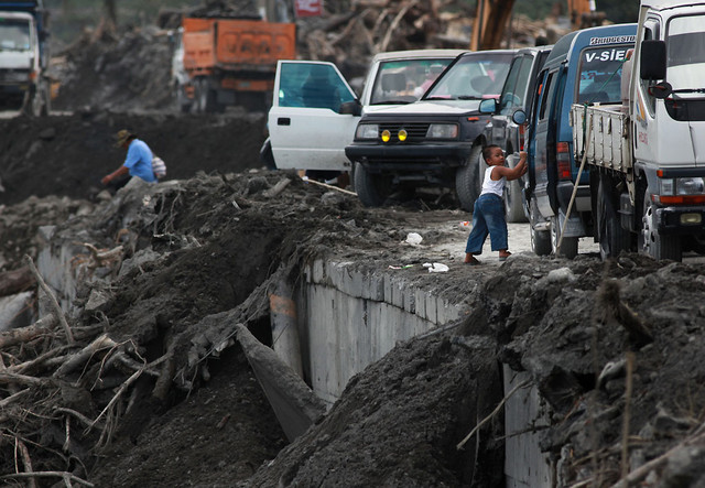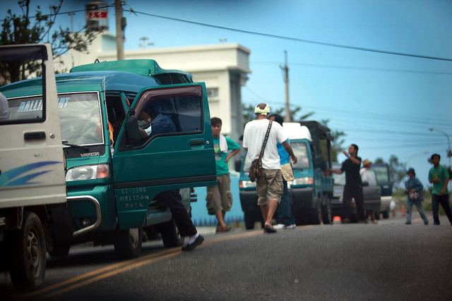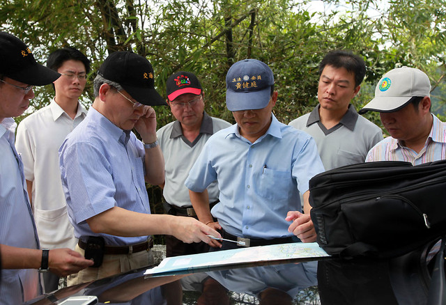 途中,我見到一台廂型車,旁邊圍了一些人,下車查看才發現是交通部長毛治國,他們一行人正攤開一張地形圖在討論,毛部長不斷透過衛星電話,在接收各地回報的交通狀況,然後一一核對土地流失的情形,雖然風災已過三日,才再收集交通資訊,似乎錯過了第一手資訊掌握,但至少他身旁並沒有帶著媒體,而是和一群專業人士一同勘災與搶救。這和許多巡視災區的大官比起,比較像是解決問題的態度,期待有二十多年事務官經歷的他,能比其他政治派任的官員更瞭解狀況,畢竟許多人命都掌握在決策者的手上。