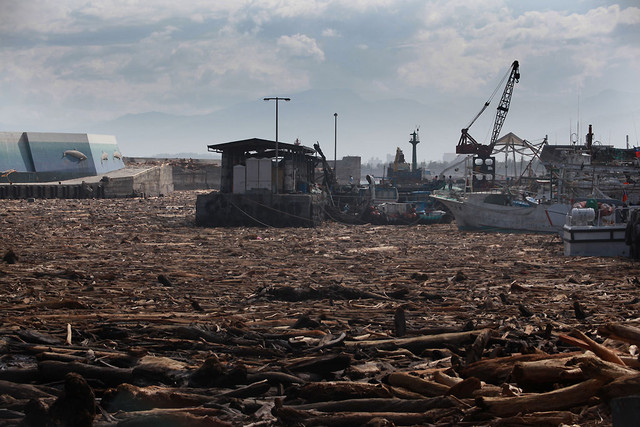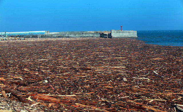 站在富岡漁港前,我見到了這一生見過最驚駭的自然景觀,從山上沖刷下來的漂流木,將港口一眼望去所有的海水表面完全覆蓋住,泊在碼頭的船彷彿像木上行舟。